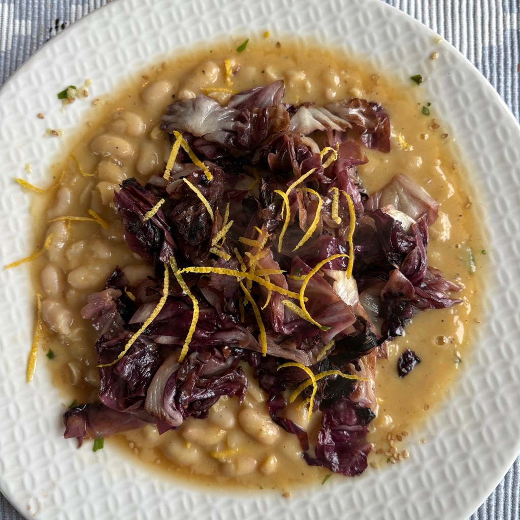 Zwiebeln und etwas Knoblauch in Butter in einer Pfanne anbraten. 4 Esslöffel von Bohnen pürieren, den Rest (von ehemals 500g Bohnen) in Fett anbraten. Mit einem schönen Guss Weißwein ablöschen und die pürierte Geschichte dazugeben. 1 Tasse Gemüsebrühe einrühren, nicht länger als 10 Minuten köcheln. Das ist halt nicht wie beim Risotto – wo alles noch stundenlang garen muss. Hier sollen die Bohnen eine Vereinigung mit der Brühe eingehen. Nach den 10 Minuten nach Gusto Parmesan und Cheddar unterrühren. Mit Pfeffer und Salz abschmecken. Parallel dazu Radicchio kleinhäckseln und in Olivenöl scharf anbraten. Auf der Bohnenpracht anrichten. Zitronenabrieb darübergeben. Nimm das – du Jungle-Camper.