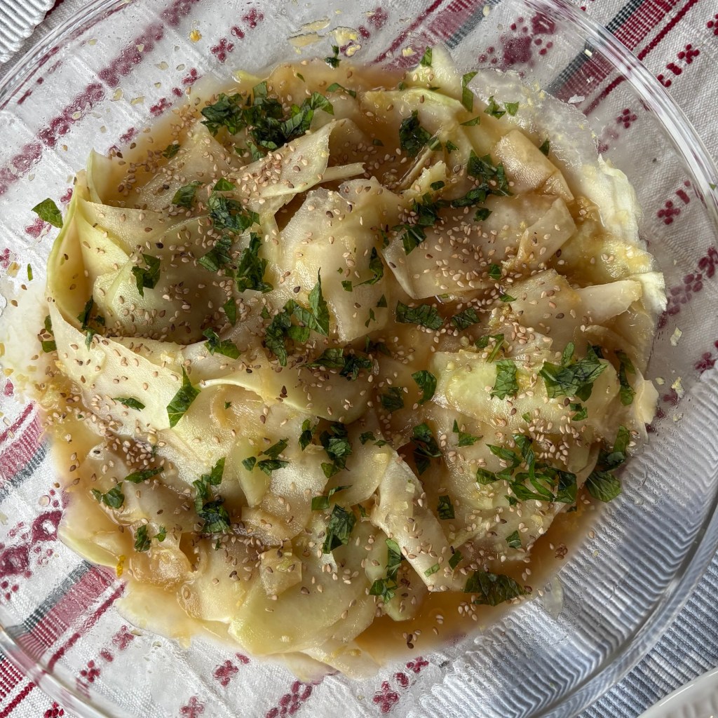 Kohlrabi-Carpaccio = 1 Kohlrabi schälen und mit dem Sparschäler viele feine Scheiben abheben, in einer flachen Schale ausbreiten, in Marinade mindesten zwei Stunden liegenlassen ; Marinade aus geriebenem Ingwer, Limettensaft, Zitronengras, Soja, Fishsauce / Oystersauce, Asia-Gewürzen nach Spaß, Sesam und Minze on top.