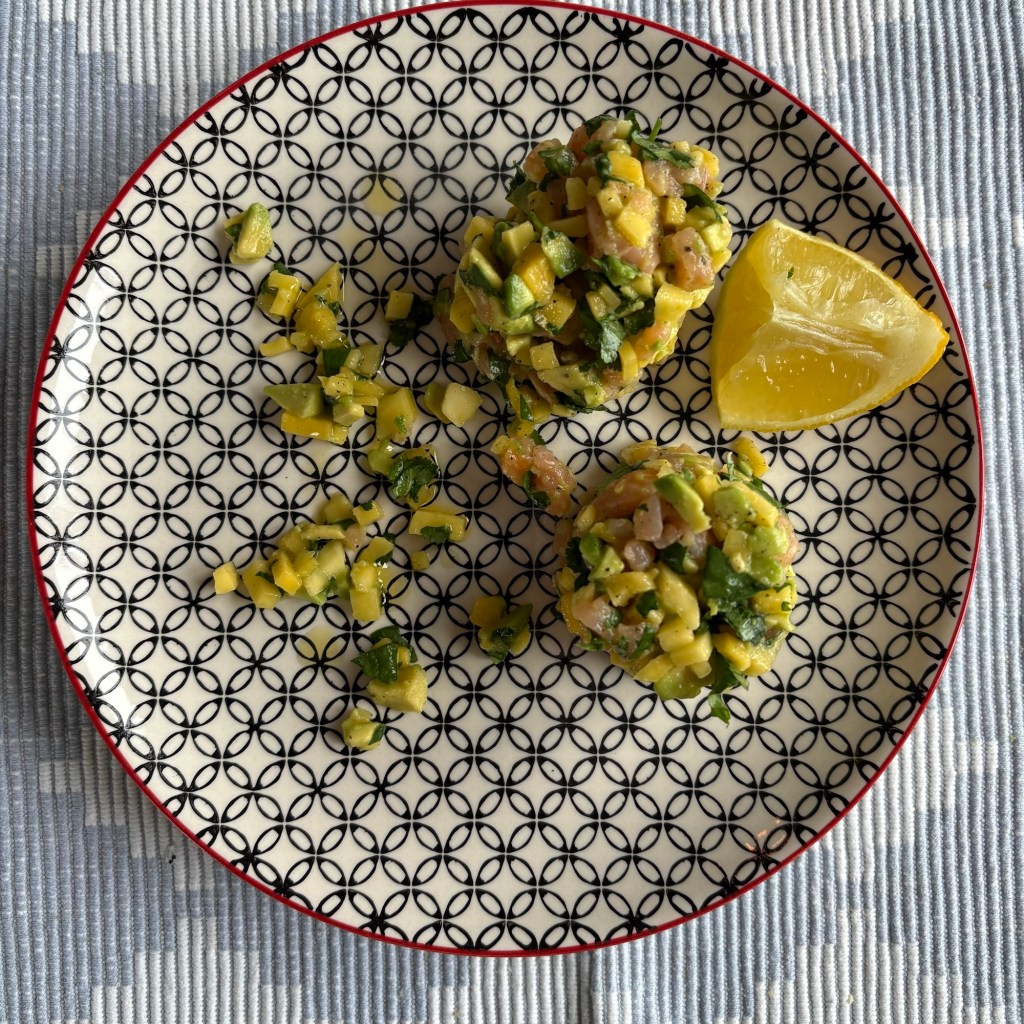 L-A-M in kleine Stücke schneiden, Zitrone drüber, Koriander drunter, Pfeffer und Salz. Vorsichtig durchmischen. In Tasse stopfen und auf Teller stürzen. Dekorieren mit Tröpfchen Öl.